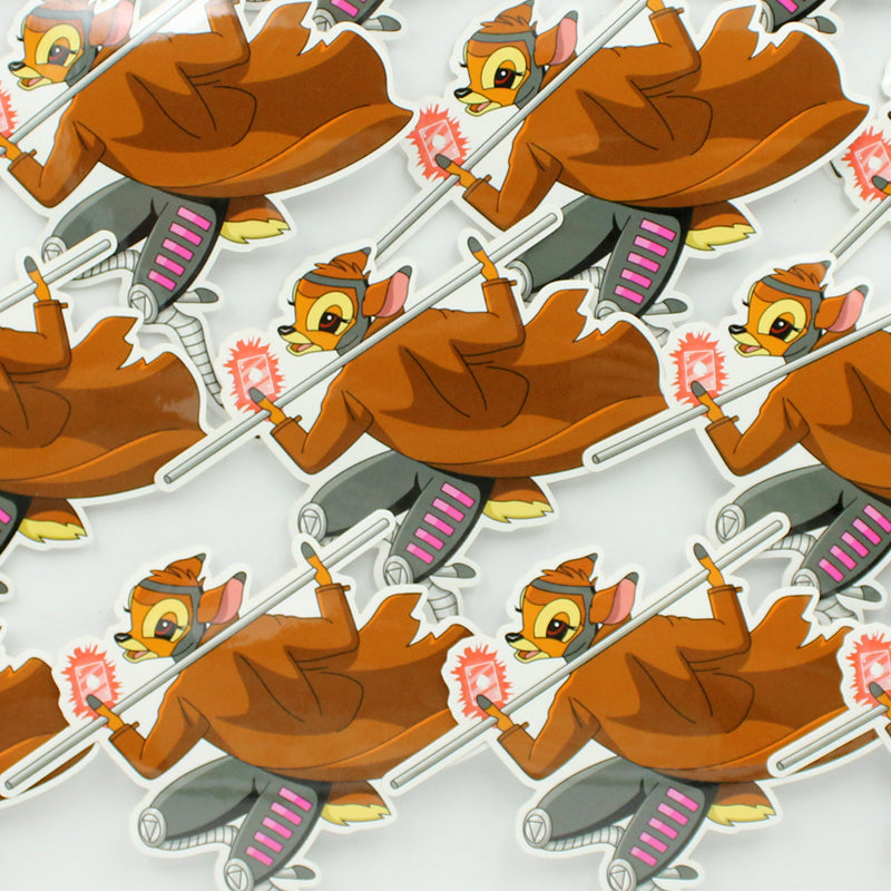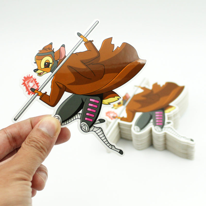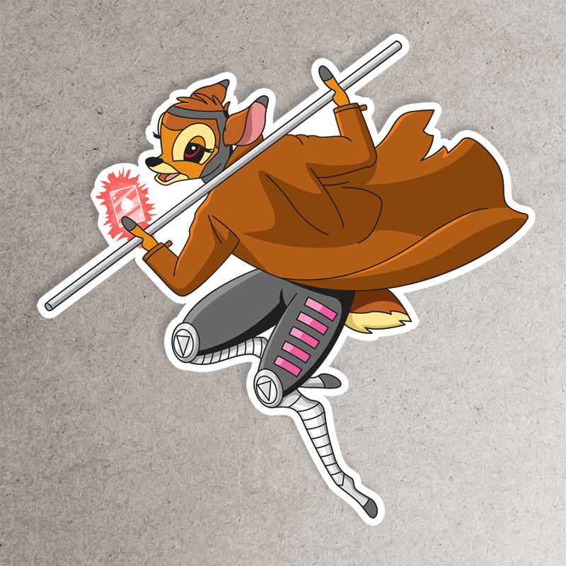 Introducing Bambit, the perfect parody sticker that combines Bambi and Gambit from X-men! These vinyl stickers are heavy-duty, waterproof, and come packaged and sealed for extra protection. Don't miss out on this quirky and fun addition to your sticker collection!