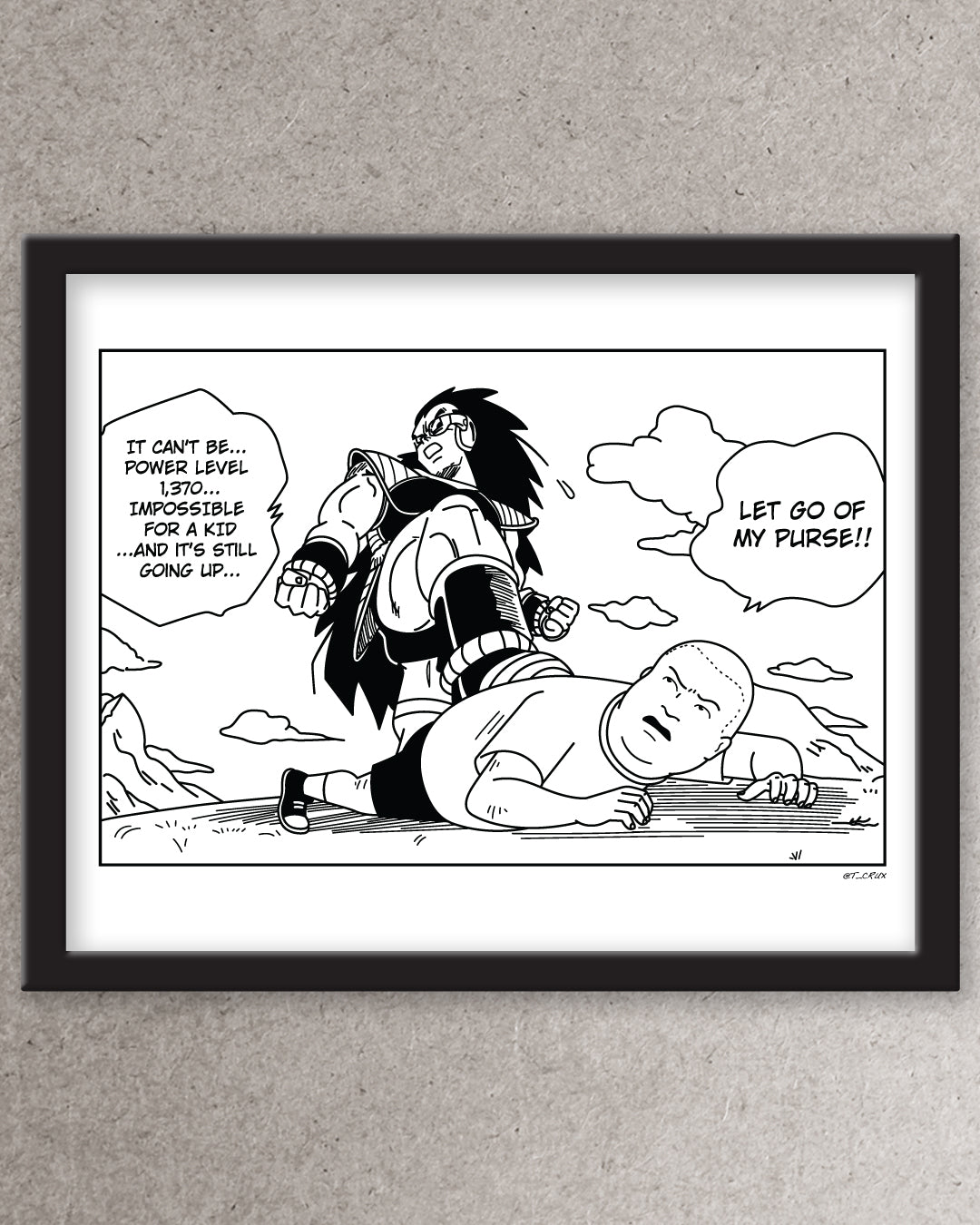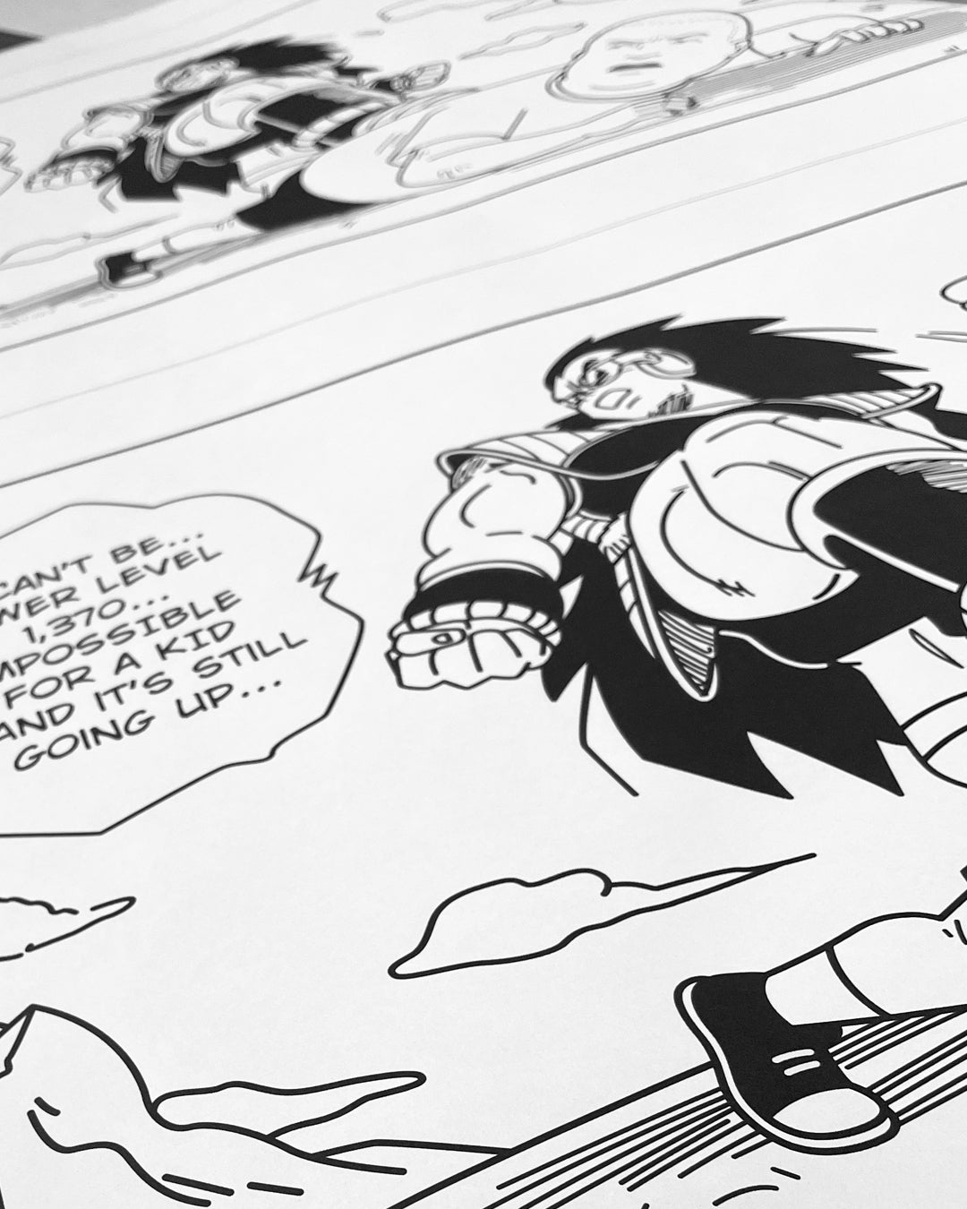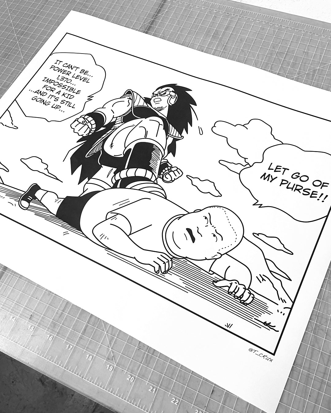 Get ready for an epic showdown with the Bobby vs Raditz Print! This large black and white print on thin manga style paper features an epic battle between Dragon Ball Z's villain, Raditz and King of the Hill's Bobby Hill. Limited to only 50 prints, this 16x20 print (frame not included) is a must-have for any fan of anime and cartoons. Don't miss out on this unique and playful piece of artwork!