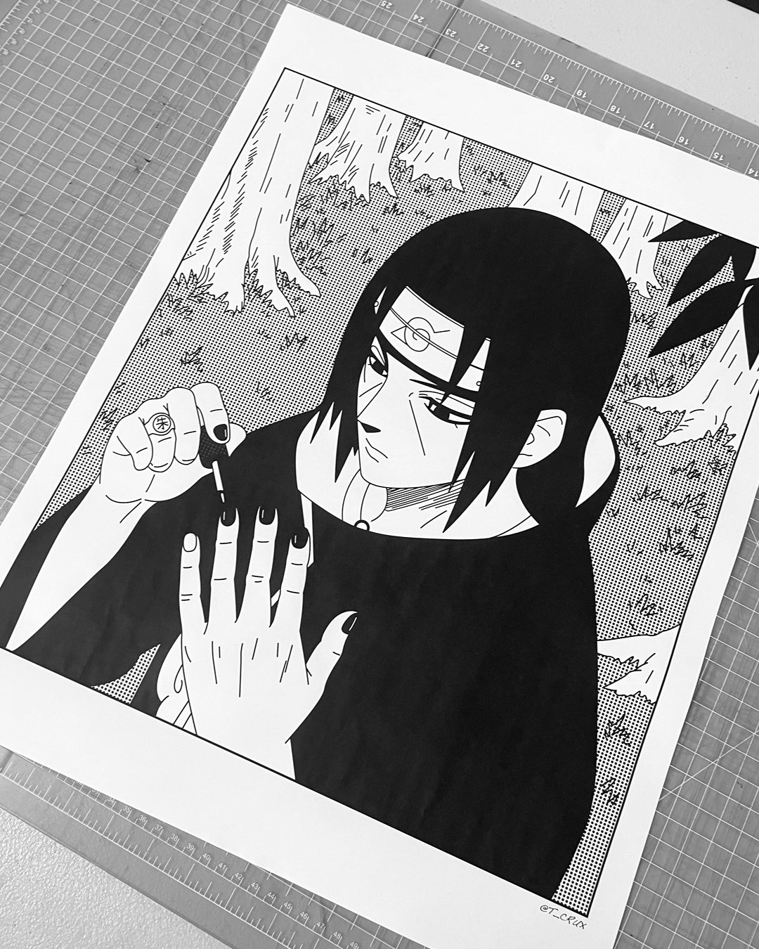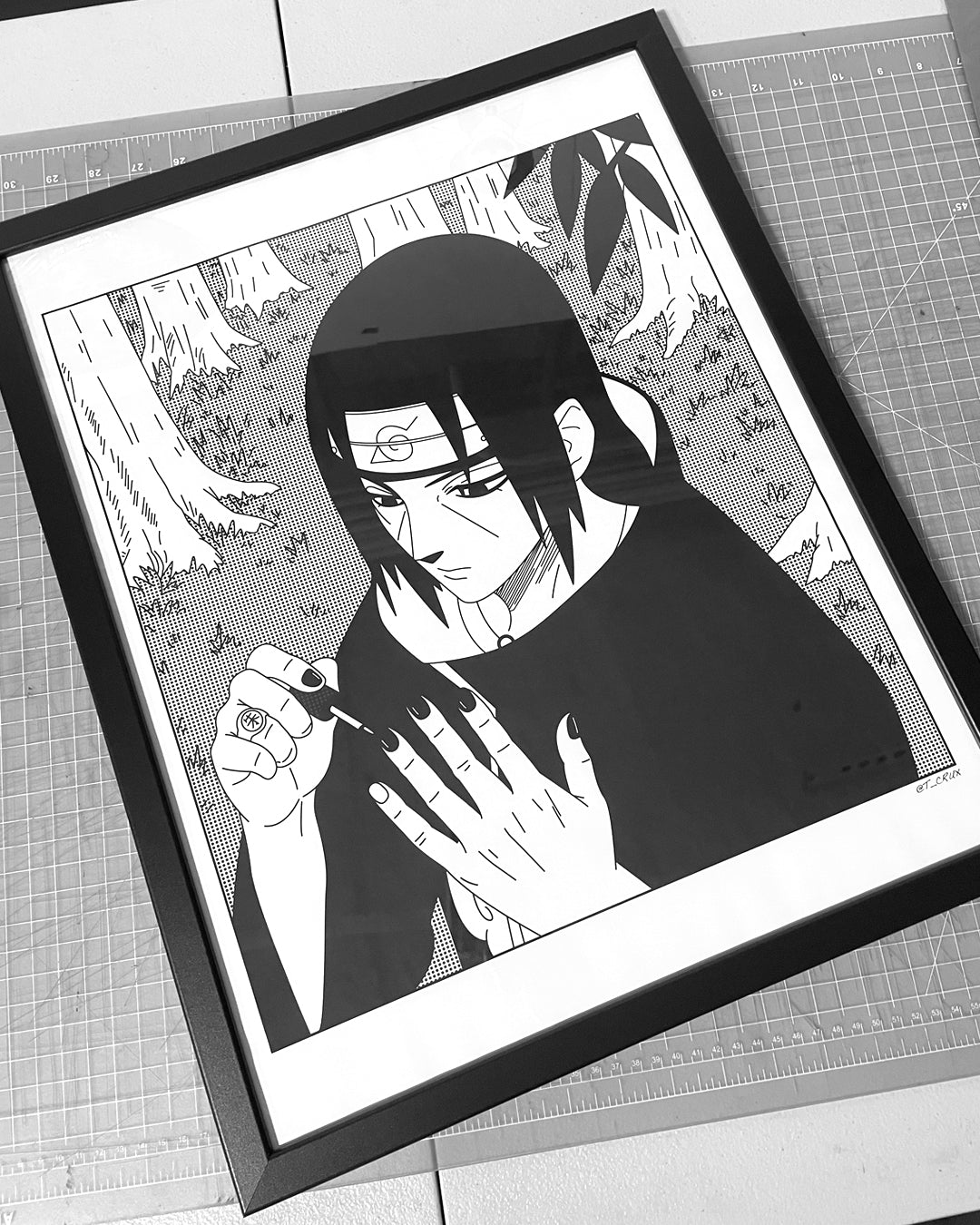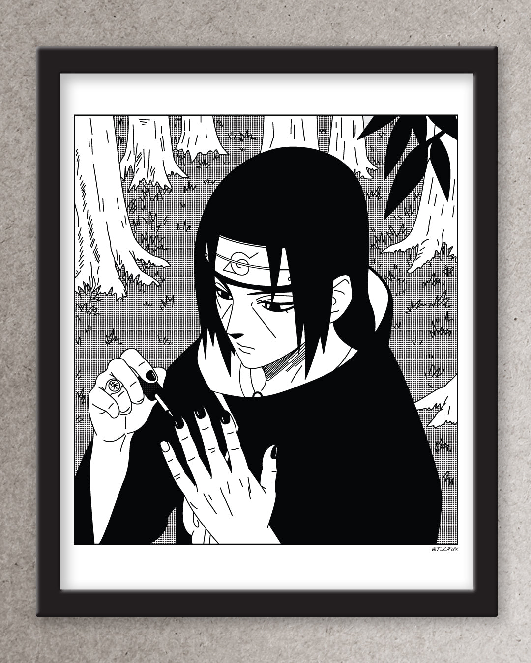 This large 16x20 black and white print features Itachi from Naruto, captured in manga style on delicate paper as he paints his nails for the Akatsuki. Frame not included. Limited edition with only 50 prints up for grabs!